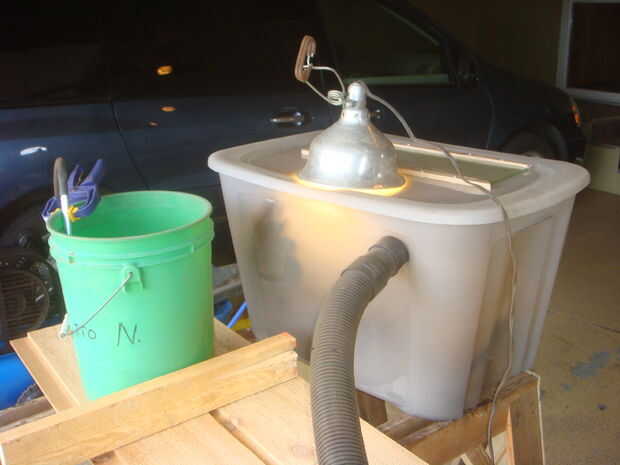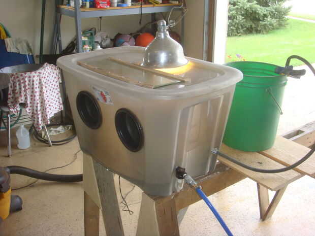 Un gabinete de chorro de arena se hizo un cuadro totalizador claro. Se hicieron dos agujeros y guantes conexión a la caja. También se agregaron puertos para manguera de aire, material de grano y la manguera de la aspiradora. El dispositivo funcionó bien y todas las piezas se limpian en un total de 7 horas.