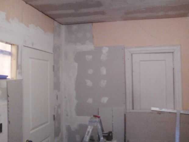 En las fotos puede decir la forma áspera de las paredes de yeso. Quería chapa de panel de yeso en los muros dañados. No había evidencia alguna exposición de pintura de plomo para que los nuevos muros encapsulan nada en las múltiples capas de pintura en las paredes. Pelar las paredes a los postes habría sido desordenado y costoso parque y alquiler de un contenedor de basura fuera. Estos son yeso de tiempo antiguo y paredes del torno. Encontré una página de periódico viejo relleno en la base del muro, pero era demasiado frágil para conservar. Uso ligero 1/2 pulgada sheetrock añadir grosor mínimo de las paredes.