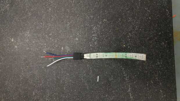 De la tira de RGB, yo había soldado V + mediante un cable, B al cable azul, G al cable verde y R al cable naranja. Después de esto decidí la base de los alambres en plástico para que no toque.