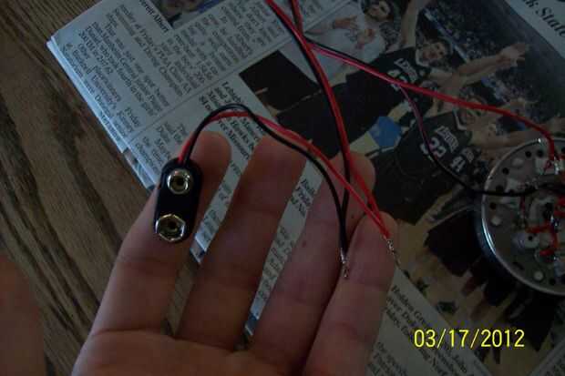 Ahora que ya tenemos el cuerpo principal construido podemos proceder a soldar. Va los necesidad de siete leds para esta próxima etapa. La soldadura de los siete leds de forma paralela. Si no está familiarizado con este término se puede Google para saber más sobre él. Cubrí todos los extremos desnudos de pegamento caliente luego pegarlos en los agujeros que ha perforado anteriormente. Luego he pulsado abajo de plano. A continuación añadir una longitud de cable y un clip de la batería de nueve voltios estilo para el accesorio fácil de las baterías. Enchufe en algún voltaje (te recomiendo unos 3-6 voltios) y asegúrese de que todos los leds iluminan cómo desea para ellos para iluminar.