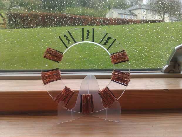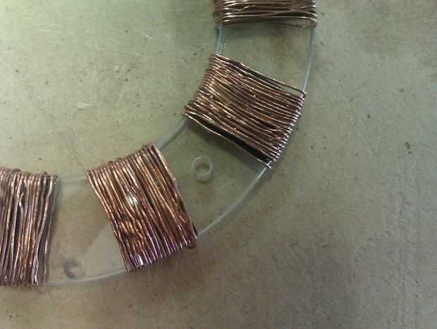 De todos modos... otra vez marcar donde desea pu el cable. tienen grupos más o menos a la mía que realmente no importa como es tu proyecto ahora. utilizando un modelo que el taladro perfore un pequeño agujero a través de uno de los anillos de plástico que acaba de hacer. ahora uno de los extremos del alambre de cobre a través del agujero del lazo y gotear un poquito de pegamento en él y dejar que se seque. ahora el rap el resto del alambre alrededor manteniendo lo mas ajustado posible mantener el aspecto profesional. hacer lo mismo en todas las secciones hasta que cayó hay suficiente cable de cada uno. para terminar la soldadura final del cobre del alambre a la parte superior del rap alrededor y dejar enfriar. trate de no doblar el alambre al rapear que alrededor de su es casi imposible sacar las curvas como ves en la imagen siguiente.