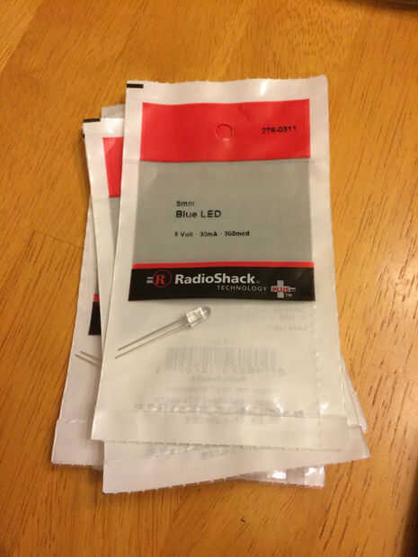 Me enteré más tarde que la compra en Ebay es mucho mejor, porque por menos que pasé de 6 LEDs en RadioShack puedo conseguir 100 LEDs y resistencias, tanto ahorro mi dinero y tiempo (con las resistencias, puedo usar una batería de 9v y no necesita la caja o interruptor) aquí están los enlaces si su interesado. LEDs y resistencias