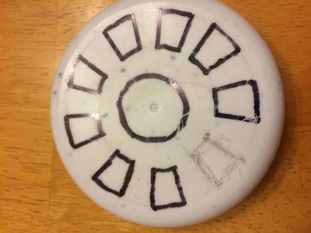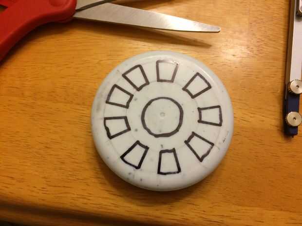 En primer lugar, encontrar una foto del Reactor Arc (aquí está la que utiliza) y cambiar su tamaño para adaptarse a ti envase de trituradores de hielo, luego use la brújula para replicar el patrón en el contenedor. Siguiente traza con el rotulador. Por último, corte los orificios con el cuchillo X-acto. Ahora tiene el shell que permitirá a través de la luz en el patrón que queremos.