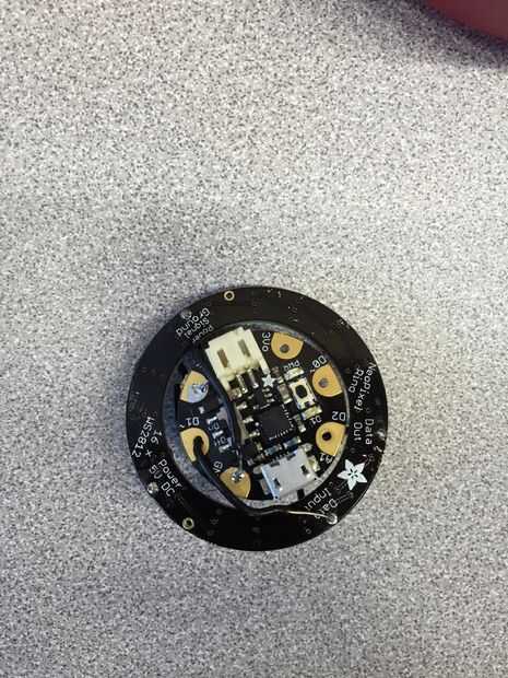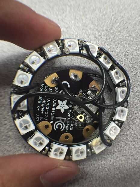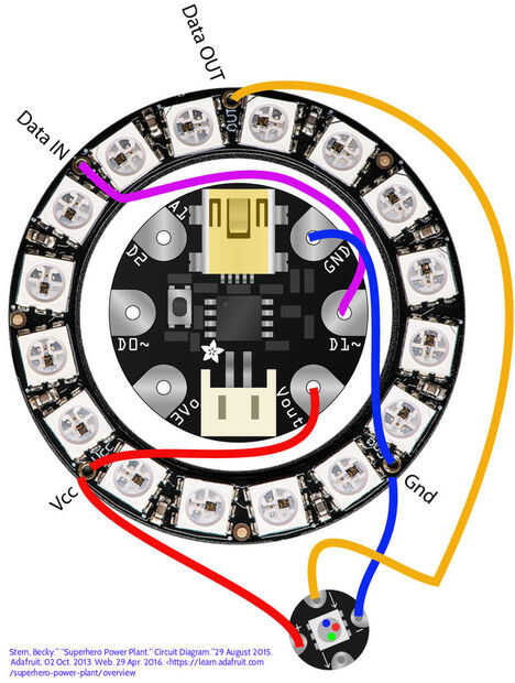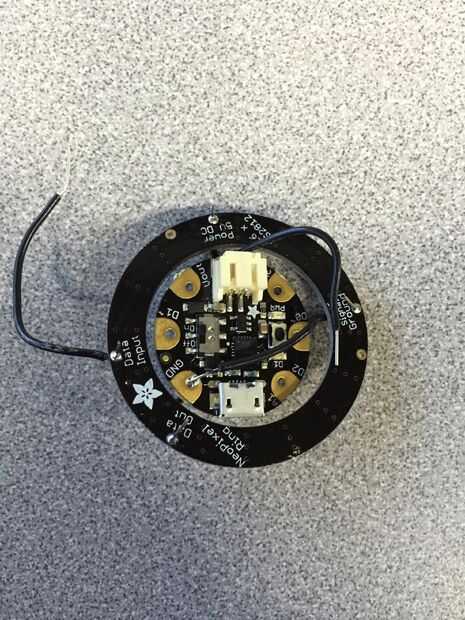 Este es el esquema que debe seguir. Copiar exactamente como se dijo, así como en el orden indicado por lo que será menos desorden y enredos. La Vcc en el diagrama equivale a 2 V + de en la versión 2.0 de Gemma de Arduino. La soldadura de las piezas junto con el anillo de NeoPixel hacia adelante como es el singular NeoPixel (sólo necesita uno) en el centro de NeoPixel hacia adelante frente a la Gemma y la Gemma mirando hacia atrás detrás de la NeoPixel. Antes de comenzar a soldar, necesitará de corte y desforre de 3 cables 2 cm y 3 cables 3 cm. Alambre sólido es preferido. También, asegúrese de que los cables pueden caber a través de los agujeros de la Gemma, anillo de Neopixel y Neopixel. Luego, a partir del anillo de Neopixel, soldadura de un lado de los cables de 2 cm en un V + agujero en el anillo, uno en el agujero de datos hacia fuera y en el agujero de tierra GND. Asegúrese de que inserte los cables de la parte superior hacia abajo. Luego de la soldadura al otro lado del V + cable del agujero en Neopixel sola además de lado, los datos hacia fuera a la flecha inferior de la singular Neopixel, uno apuntando hacia el centro y el GND tierra al negativo de la Neopixel. El anillo de Neopixel y Neopixel debe ser orientada hacia lo mismo con el Neopixel centrado en relación con el anillo de Neopixel y ligeramente (1 a 2 cm) frente al anillo de Neopixel. Luego, soldar los cables de 3 cm en el microcontrolador de Gemma en los orificios de Vout, GND y D1 con los cables en el frente. El microcontrolador de Gemma se enfrenta la dirección opuesta como el Neopixel y anillo de Neopixel. También tienen Gemma microcontrolador micro puerto USB hacia arriba hacia los datos del anillo Neopixel agujero. Luego, doblar los alambres detrás y soldadura al otro lado del alambre soldado al agujero Gemma GND en el agujero de la tierra en el anillo de Neopixel. La soldadura del otro lado del cable D1 y el datos en agujero en datos en el anillo de Neopixel. Por último, soldar el otro lado del Vout al alambre Vcc. El microcontrolador Gemma debe también centrarse, como la Neopixel es, poner un poco (1 a 2 cm) detrás del anillo de Neopixel como para hacer subir la programación más fácil.