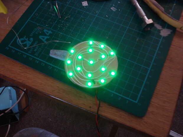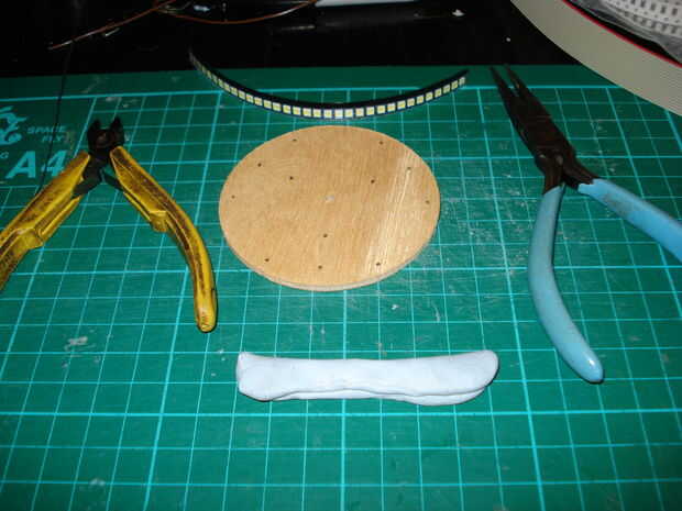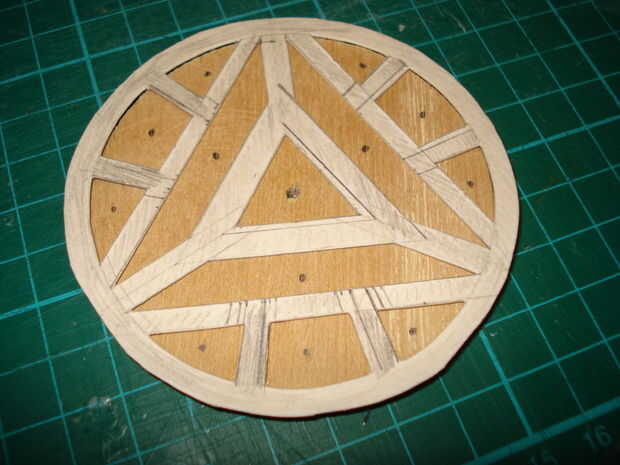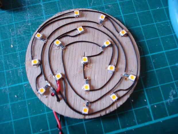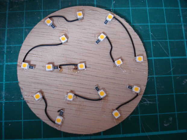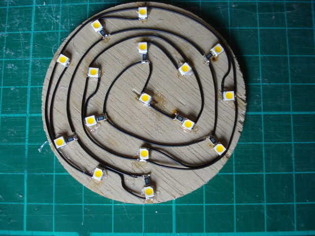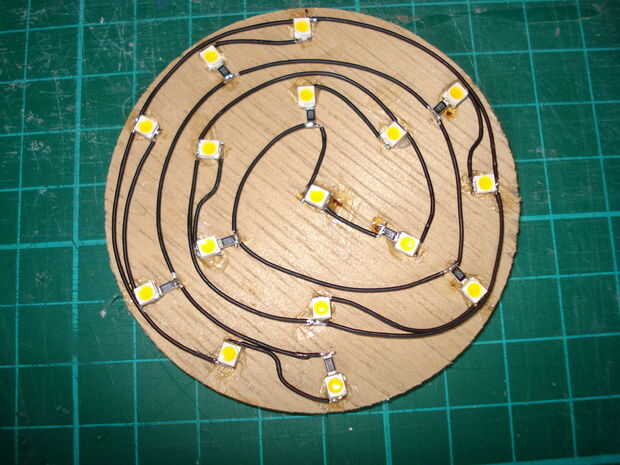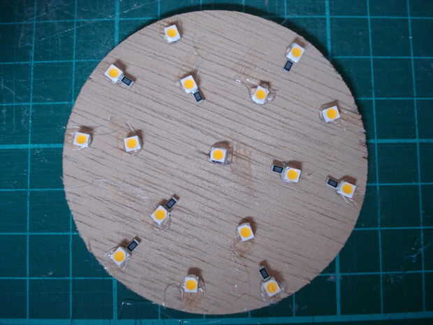Utilizando la plantilla se podrá leer en el siguiente paso, coloque sobre el disco madera y utilícela para marcar la ubicación deseada de todos los LED. El LED central estará