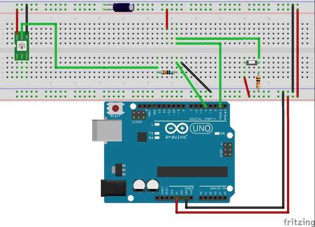 Voy a mostrarle esta configuración primero con un Arduino Uno que sirve como el microcontrolador. Sin pernos que deba cambiar o reasignar en el código para hacer este trabajo. Verás unos pasos más adelante que todos nosotros entonces tenemos que hacer es sacar los cables que van al Arduino y reemplazarlo con el ATTiny, agregar fuente de alimentación, y usted está listo para probar la configuración final. A los efectos del diseño y la construcción final me gusta usar tres colores de hilo en aplicaciones simples como ésta. El rojo siempre es Vcc (tensión alta), siempre es de tierra negra, verde es siempre datos. Ésos son los tres colores de cable de conexión que tenía disponible, usted puede preferir algo más. Lo que flota su barco. Coloque los componentes como he mostrado en el diagrama de Fritzing anterior.