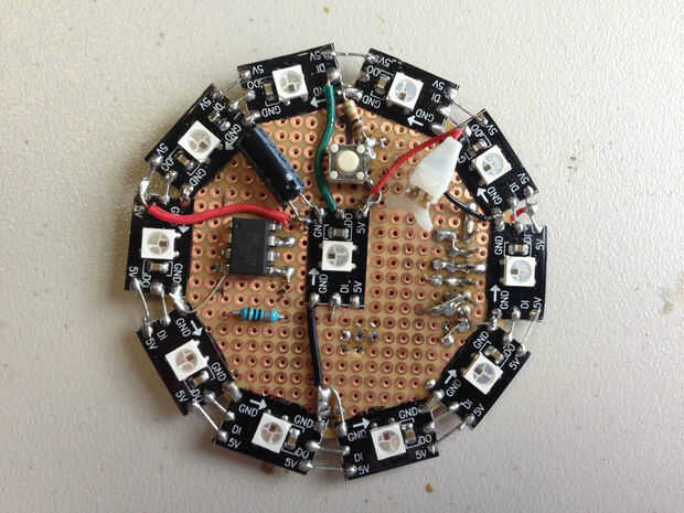 Ahora es el momento para cablear los LEDs juntos. Esto ayudará a darles cierta rigidez al completar el resto del proyecto. Puede utilizar trocitos de cable de conexión pero he encontrado que lo mejor para las conexiones de distancia pequeña como esta es usar repuesta lata de las patas de las resistencias, a través de LEDs de taladro, etc.. Cuando la soldadura caliente cerca de estos repuestos pedacitos de estaño casi "saltan" en el cojín de la soldadura. Realmente hace soldar estas conexiones extremadamente fáciles. Necesita conectar la "tierra" todos los botones juntos alrededor del círculo. A continuación, necesitará conectar todos los pines "Datos", excepto para los dos pilotos "top". Si nos fijamos en las fotos adjuntas pueden ver existe una brecha entre los dos mejores donde no hay conexión. Esto es porque los datos de la señal sólo viaja en una dirección y sólo puede conectarse en serie, paralelo no si desea que el código funcione correctamente. Ahora soldar todos los pads de "5V" entre sí. Puede dejar el centro LED desconectado por ahora.
