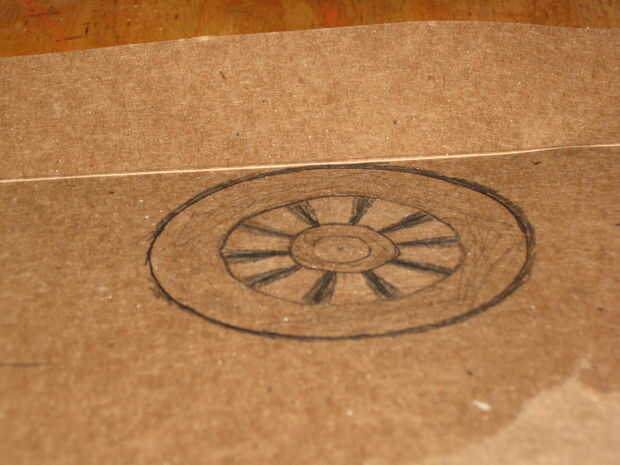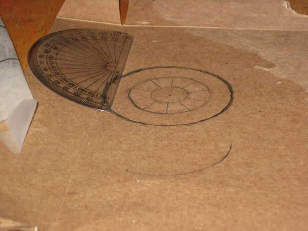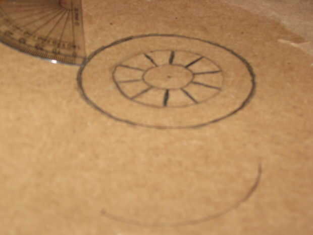 dentro de ese círculo que acaba de dibujar, hacer otro círculo de cualquier tamaño que desee. sólo tiene que ser menor que ese círculo. dibujar un punto en el centro. su transportador y esperando que usted sabe cómo usarlo correctamente, una línea de 36 grados. Siga haciendo esto hasta que tienes todo el camino alrededor, debe ser 10. luego los oscurecen hasta y hombre un poco mayor como en la tercera pic.if se mira de cerca, se puede ver ellos garabateadas en ligeramente con lápiz en algunos puntos. hacer eso también. le dirá lo que no debe cortar.