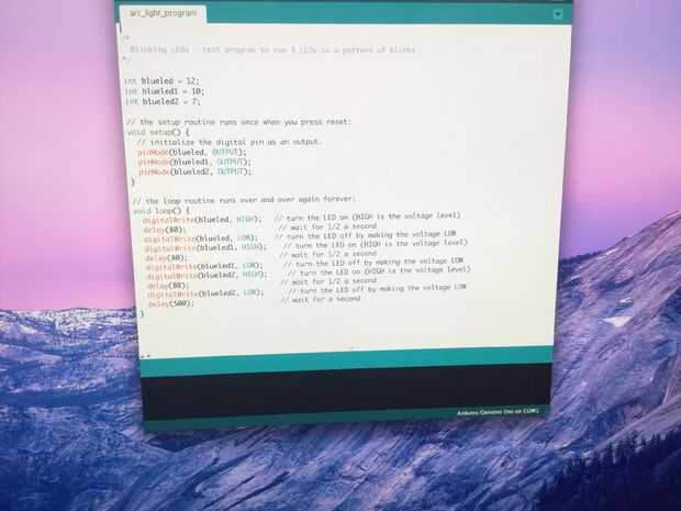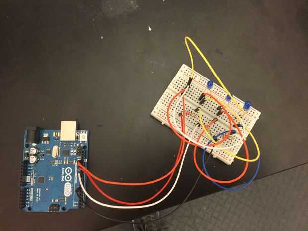 Para programar tu arduino, de entrada este código en su sistema del programa. Después de esto, definir que LED luces y el protoboard. El arduino vino con los cables, luces y un tablero por lo que deben tener los materiales. Siga la imagen de arriba para configurar el circuito.