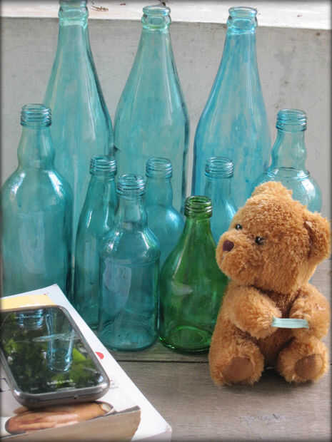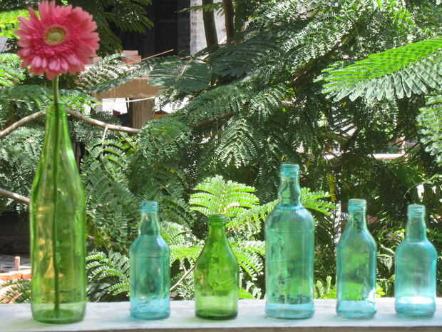 Prefiero utilizar un color de fondo de las botellas (azul) y luego solo una botella de color rosa o verde. Esto hace que el pop de color verde.