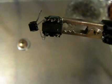 Lo primero que tienes que hacer es soldar el Transistor a la parte superior izquierda y la parte inferior izquierda del transformador. El transistor tiene la superficie plana mirando hacia fuera. Así que hay poner la mitad de la pierna a la pierna izquierda superior del transformador. Entonces la pierna de abajo en la pierna izquierda de la parte inferior del transformador.