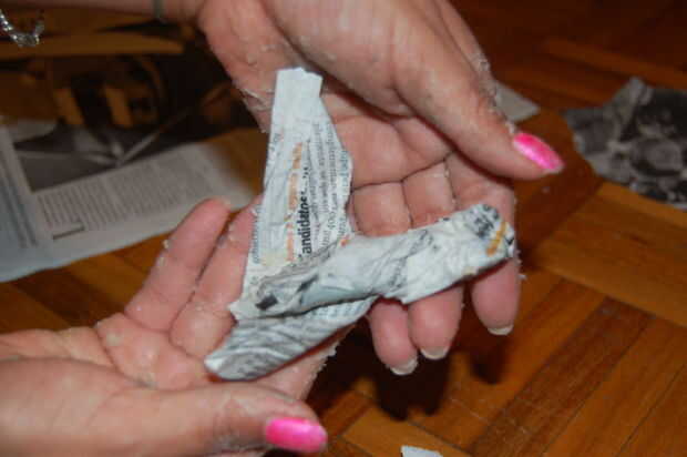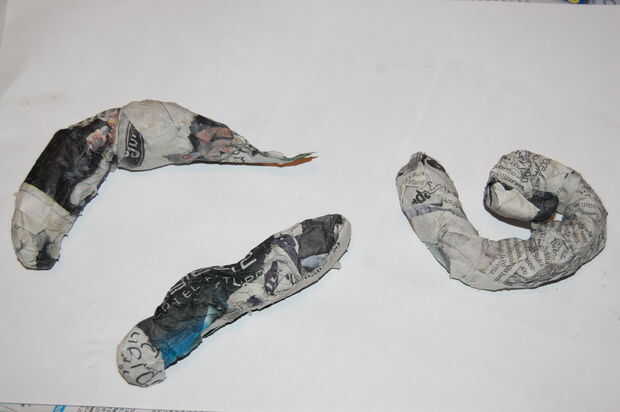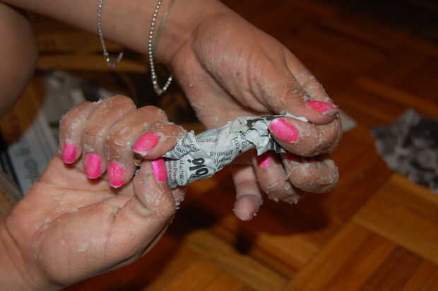 Primero, rasgar el periódico en forma de rayas. Luego, unte el pegamento en todo las rayas del periódico y girar para conseguir la forma que desee su caca que. Trabajo mientras el pegamento está aún fresco porque se convertirá en más difícil con el tiempo. Piense cómo usted está va a utilizar el impulso y darle la forma adecuada. Hice cuatro los diferentes, un clásico de dibujos animados como de caca, que parece medio cayendo desde un borde (que lo se porqué :-)), uno empapado (realmente caminaba sobre él una vez para darle la forma correcta) y una normal. Por último, esperar unas horas hasta que sus creaciones estén secas.