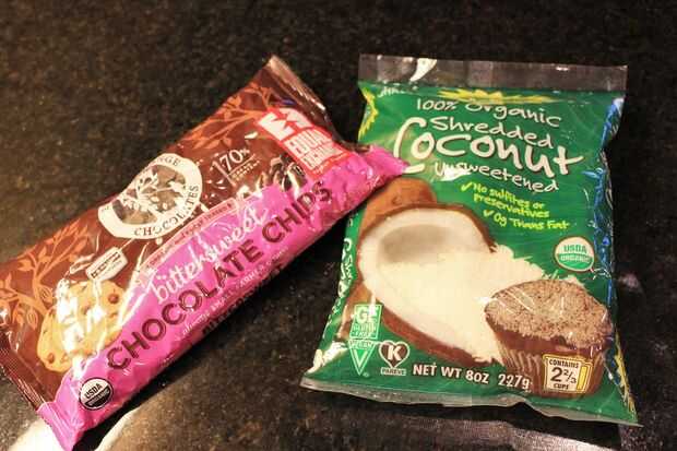 2. transferir se mezcla a un recipiente grande y agregue cualquier "complementos" a mano. Yo utilicé 1 taza de chispas de chocolate agridulces y 1/2 taza de coco rallado sin endulzar. Usar lo que quieras o nada en absoluto.
