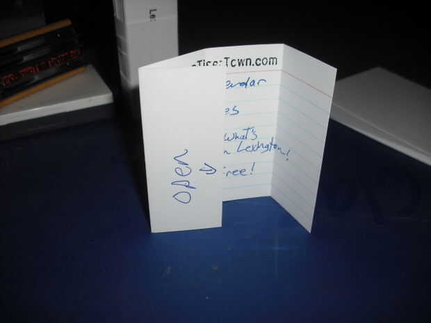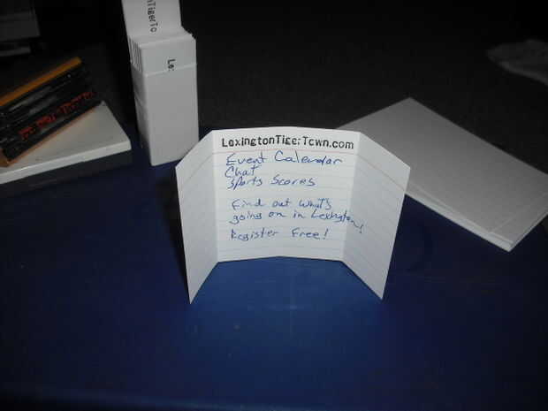 Sello o escriba el nombre del producto o lo que sea en la superficie externa y más información detallada sobre la superficie interna de la tarjeta y dóblela de nuevo para arriba. Sus anuncios de la bandera de la vida real están listos para caer en un estante de una tienda, o en el mostrador de su biblioteca local.