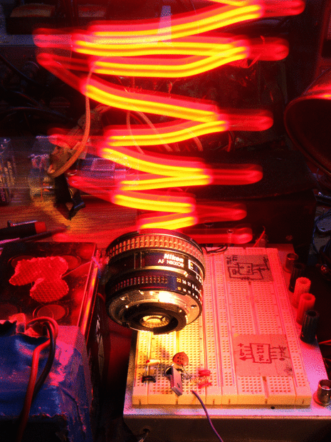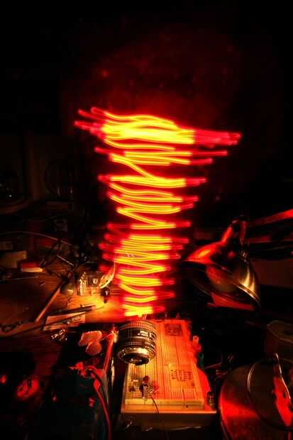 Si tienes una cámara fotográfica como una DLSR, tiene una opción "B" ("Bulbo" o larga exposición), tratar de fotografiar los senderos de la luz del aparato. Una combinación de flash y tiempo de exposición también puede ser bastante sorprendente como el flash hará visible el sistema bajo prueba, mientras que la larga exposición hará visible el material virtual otra manera invisible (por ejemplo, la sightfield de la cámara bajo prueba). En este caso tiene 2 cámaras: la cámara de prueba (uno que exhibe el fenómeno) y su cámara fotográfica (uno que es fotografiar la cámara fotográfica que exhibe el fenómeno).