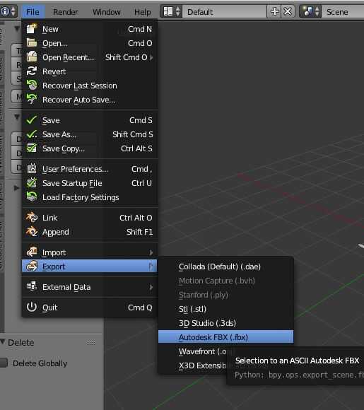 Cualquier ruta que decida tomar lo importante es asegurarse export/save lo como archivo fbx. Para otros proyectos utilizan Solidworks pero no hay opción de .fbx, así ahorraría como un .stl luego abrirlo en la licuadora para que sea un .fbx. La última foto muestra dónde exportar .fbx en blender. También recomiendo agregar materiales en blender. He estado usando el difuso para mantenerlo simple. Si quieres darle a tu textura de objetos va a necesitar a UV desenvuelva lo y exportar la textura independientemente. También cuando exportación de blender de la forma, al elegir el lugar y antes de realmente exportar, en la parte inferior izquierda te tiene la opción de "exportar modelos seleccionados solamente" que se puede utilizar si desea. Asegúrese de seleccionar los modelos antes de realmente exportar.