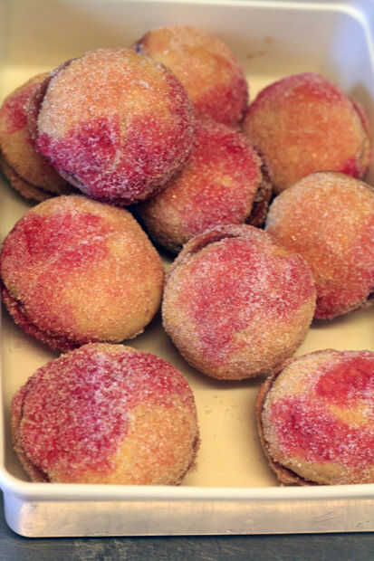 Poner el melocotón en el recipiente lleno de azúcar y use una cuchara para echar todo el azúcar y el melocotón hasta que estén completamente cubiertas. Pick out (uso de la cuchara) y ponerlo en una caja o en una placa para secarlo cuidadosamente.