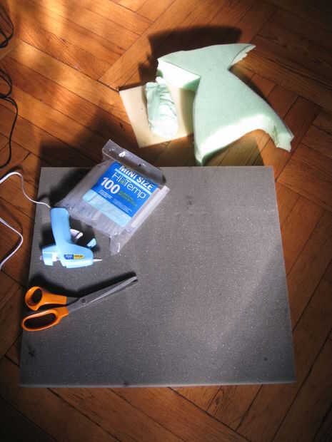 - Mínimo de 2'x 2 x 4"(aproximadamente) de espuma de artesanía. Tuve que poner gris alrededor de un paquete, y verde es el color normal que encontrará en tiendas de artesanía. Usted puede incluso utilizar cojines de un sofá viejo. Viene en diferentes espesores y tamaños, y ser honesto, grueso puede ser mejor, como se requeriría menos pegado.
