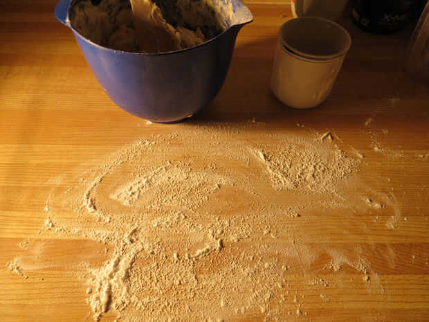 2. Si la masa está pegajosa, sigue añadiendo una 1/2 taza de harina hasta que no es pegajoso, y se puede rodar en sus manos fácilmente.