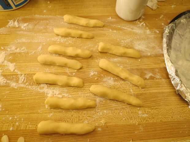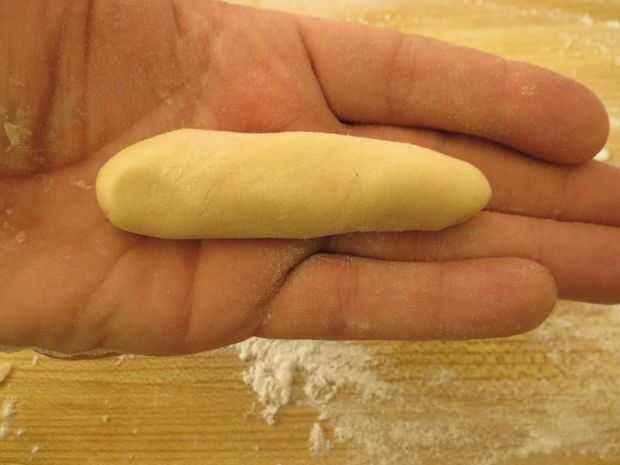 3. Poner la masa de la serpiente sobre la mesada enharinada y con los propios dedos como guía añadir algunos contornos y al final de la palma del dedo un poco plana vertical. Trabajo más fino que la versión final y aplanar un poco.