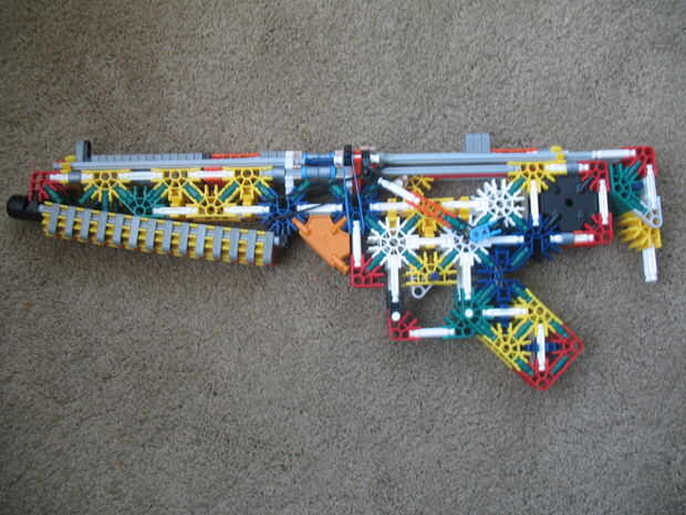Después de la construcción y experimentación con muchos diversos estilos de gatillos y mecanismos de disparo y k'nex armas, vino para arriba con esta arma. Quería que mi pistola no sólo bien el fuego, pero también se ven muy bien. Así que después de descargar un par de fotos de mp5 real en mi ipod, decidí trabajar en mi proyecto. La pistola cuenta con una carga de fondo redondo 25 mag (barras blancas) de, una culata ajustable, un espolón posterior extracción tradicional con un gatillo cierto bloqueo automático y un grip muy cómodo que fue posible gracias a este chico.