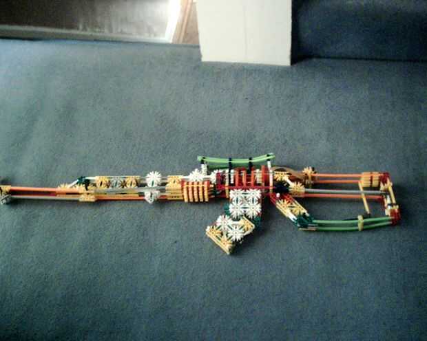 esta es el arma más poderosa de K'NEX creo que porque puede perforar 2 cerveza o COLA puede y destruir disco compacto fácilmente debido a la muy fuerte 4 gomas (yo uso 2 ligas diferentes) también incluye una gran revista para 5 K'NEX largo gris afila