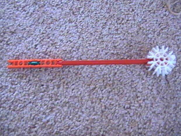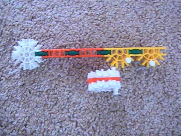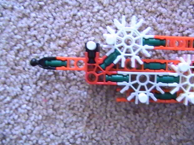 6. parte posterior del arma-Conecte los copos de nieve sobre los conectores amarillo con barras verdes y deslice los copos de nieve en la barra azul. No supone conectarse pero deberían ajustarse perfectamente aquí sin moverse.