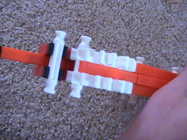 3. parte delantera de la pistola-agregar conectores rojo a cada lado para conectar la parte superior con el arma principal y luego conectar los dos de ellos con nobs negro y blanco del conector.