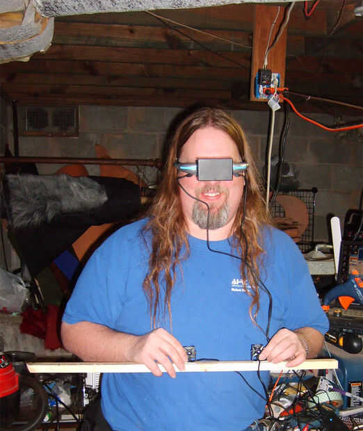 Sí, ese soy yo. sí que soy mucho de un geek. Jugando con la visión estéreo, resolución de algunos problemas de paralaje. las cámaras son más lejos aparte que mis ojos por lo que los efectos estéreos son muy únicos. Pero ahora la verdadera diversión comienza cuando construimos el arte alrededor de la tecnología.
