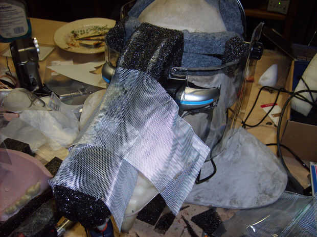 Bueno ahora empezamos con la malla de aluminio. Esto es una malla de hobby streach que utilizo para esculpir la máscara. Sobre todo esculpir cada pieza y fijar con pegamento caliente luego me tome un palillo de acero inoxidable y comenzar a esculpir las formas de la parte trasera. de la malla.