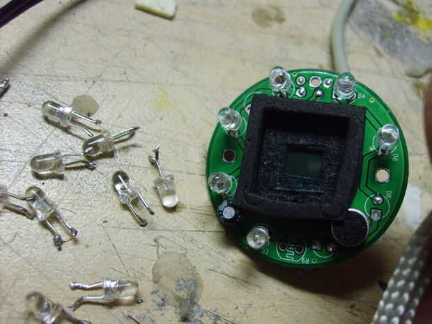 He encontrado mejores cámaras para hacer tanto el color y la visión IR, lamentablemente se vino con un anillo de sombrero de LED IR no iban a trabajar para nuestra aplicación desde la óptica de la cámara se va a estar rodeado de ojos plásticos. Puesto que estos ya vino con LEDS IR parecía una buena idea retirar y reciclar en el iluminador IR para la nariz.