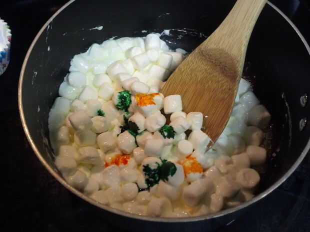 Derretir la mantequilla a fuego medio bajo, luego agregar los malvaviscos. Una vez que se disuelven (sobre todo), agregar 8 gotas de colorante verde y 3 gotas de amarillo.