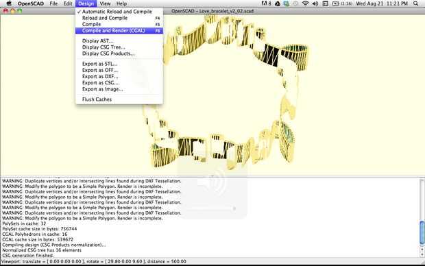 Archivo -> abrir para abrir el archivo .scad en el último paso. Si recibe advertencias, solo ignorarlos.Diseño -> compilación y procesamiento para construir el objeto. Esto podría tomar un tiempo, dependiendo la complejidad de su objeto.