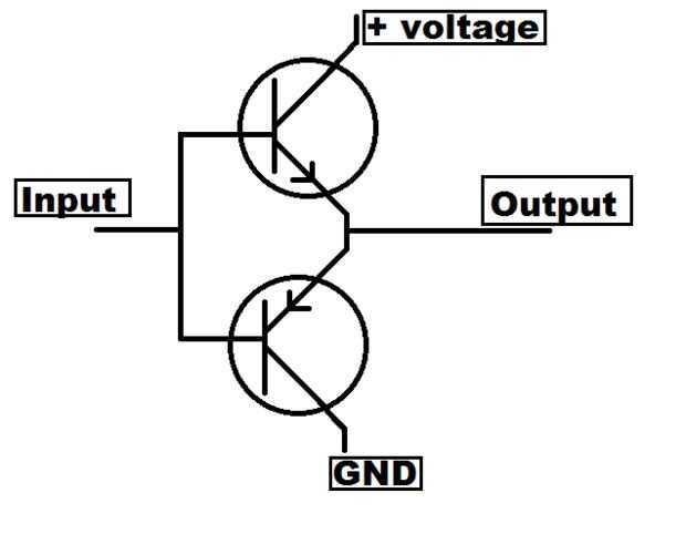 Un tótem consiste en un emisor de transistor dispuesto PNP y NPN en emisor, con sus bases acopladas. La señal de salida se toma del encuentro entre el emisor del transistor NPN y el colector del transistor PNP. La ventaja de esto es la facilidad de uso, pero la desventaja es que los transistores calor y esto puede (depende de tu aplicación) crear suficiente calor para justificar un disipador de calor.