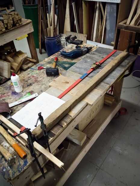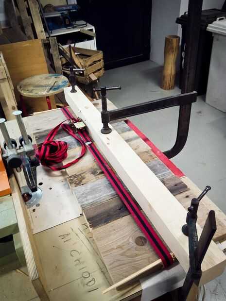 Guardé todas las tablas que fuertemente presionadas con un cinturón y seguí en la mesa con un tablero y un par de pinzas. Esto es necesario ya que la tensión de la correa intenta separarlas.