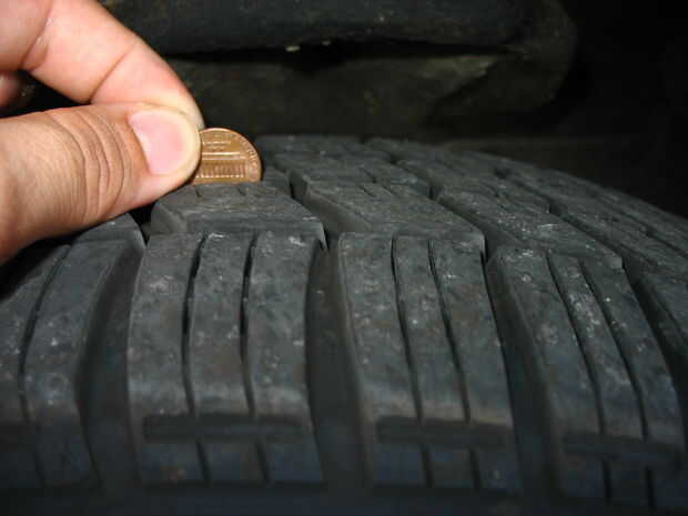 Pisada profundidad puede medirse con un medidor, o más simplemente usando un centavo y un cuarto, como se ilustra a continuación. Si se cubre la cabeza de Lincoln cuando se inserta un centavo en la pisada de la llanta, entonces más de 2/32" la banda de rodadura queda. Si se cubre la cabeza de Washington cuando un cuarto se usa, más de 4/32 queda, y si se cubre la base del monumento a Lincoln en un centavo, más de 6/32" queda.