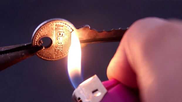 Toma la llave que desea hacer la llave de repuesto, uso más ligero y llama un lado del clave humo se acumula en la superficie de la llave ahora Coloque la llave a un lado y deje que se enfríe