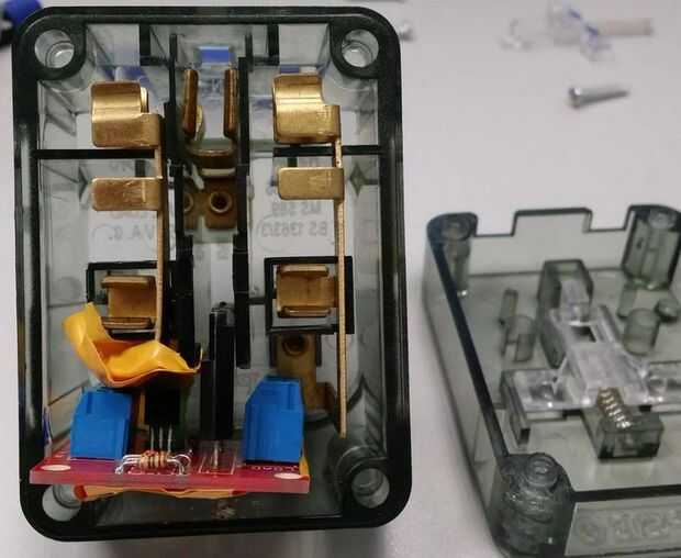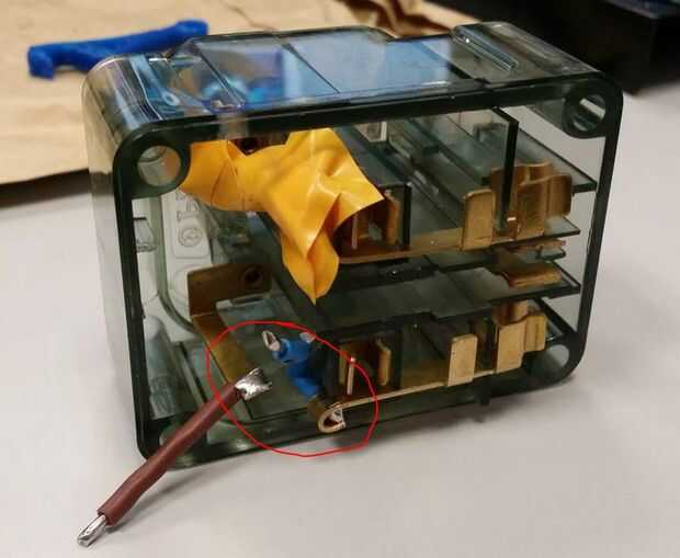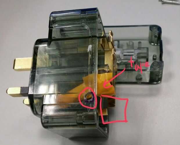 3. Taladre un orificio (círculo en rojo) en el enchufe multi para dar cabida a 3 hilos (VCC, GND, SIG) de la PCB de la SSR. Elimine el contacto de latón (Plaza Roja) en la conexión de alambre vivo. Los extremos de quitar se soldar con cables para ser conectado a la PCB de la SSR. Utilice cinta eléctrica cuando sea necesario para aislar los extremos expuestos.