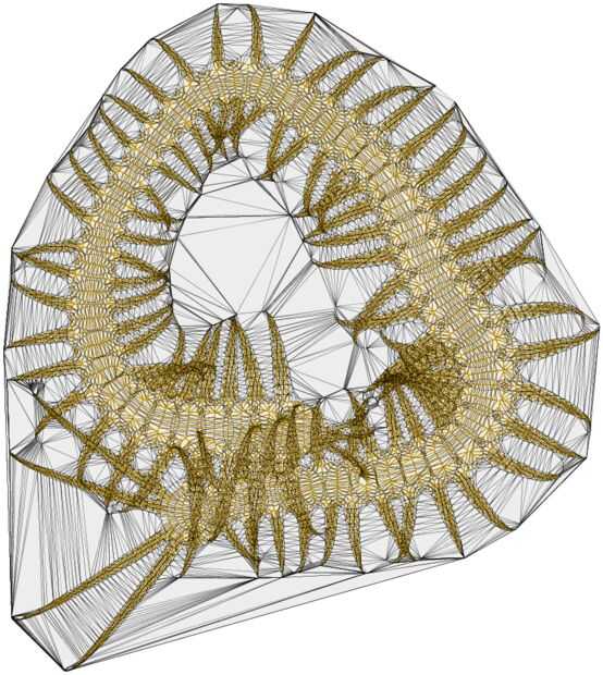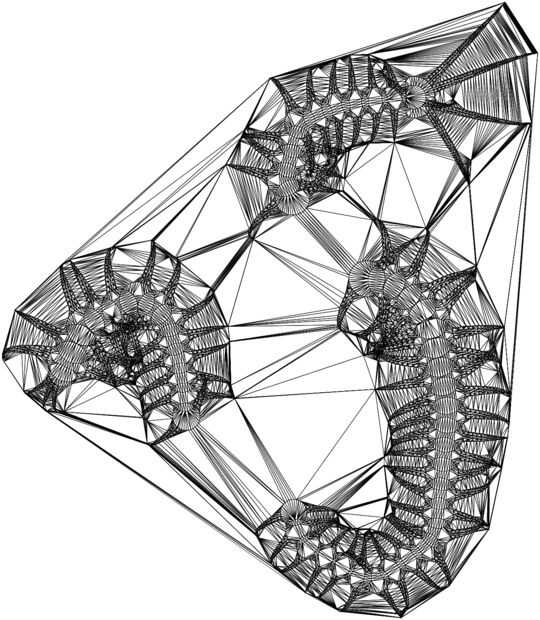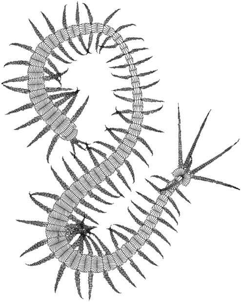 El ciempiés se realizó usando principalmente los nodos centrales y funcionalidad. Las matemáticas detrás del esqueleto se hicieron sobre un archivo de python adicional que hace segmentación de Voronoi. El esqueleto sí mismo es el camino intermedio eje derivado de esa segmentación. NodeBox te permite agregar fragmentos de código para el sistema.