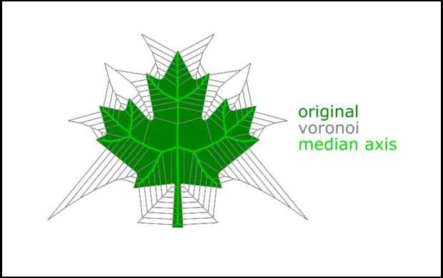 He añadido un ejemplo sobre una hoja verde del arce que muestra los diferentes resultados de Voronoi y eje intermedio basado en una forma (original).