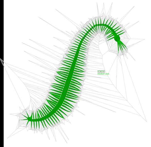 El esqueleto se basa en el eje intermedio. He utilizado una calculadora de diagrama de Voronoi existente. Originalmente fue escrito por Steven Fortune en el laboratorio de Bell y traducido a Python por Bill Simons. El diagrama de Voronoi es la base para la creación de la estructura del eje intermedio.