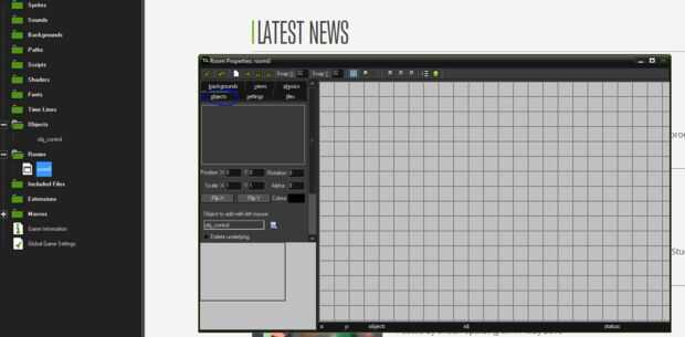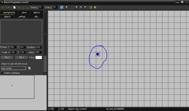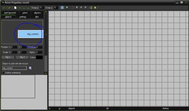 Seleccione la pestaña de objetos y haga clic dentro de la derecha de la caja por debajo de ella. Seleccione el objeto que acabamos de crear (obj_control) y haga clic en cualquier lugar en la sala (zona red) para que veas el círculo azul pequeño.