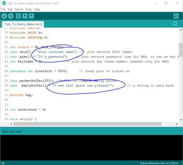Ahora escribe el nombre de red y tiene contraseña que se muestra en la imagen (círculo superior). Asegúrese de mantenerlos dentro de las comillas. También puede editar el mensaje de que la Edison enviará a Game Maker (el círculo de la parte inferior). Asegúrese de que también es así entre comillas.