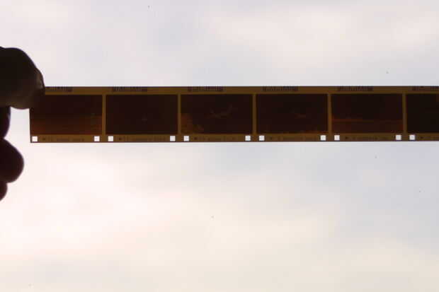 4. Tire de la película todo el camino. Cortar 6 tiras de exposición en 35mm, 5 descuentos negativo de marco.