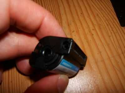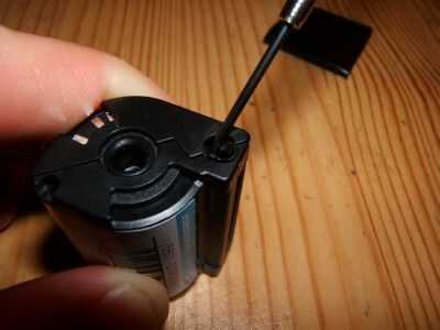 2. Busque en el lado del cartucho que tiene el código de barras (lo contrario del lado que tiene las pictografías). Allí usted verá un pequeño agujero que tiene un pedazo de plástico del retén. Utilice una herramienta y oprima el retén y gire la puerta abierta.