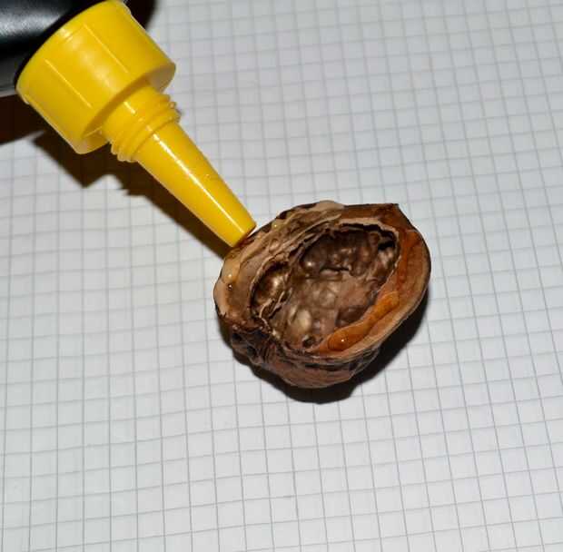 Pegamento de nuevo juntos la 2 mitad de la nuez con el pegamento de madera.