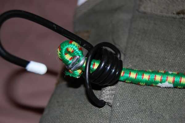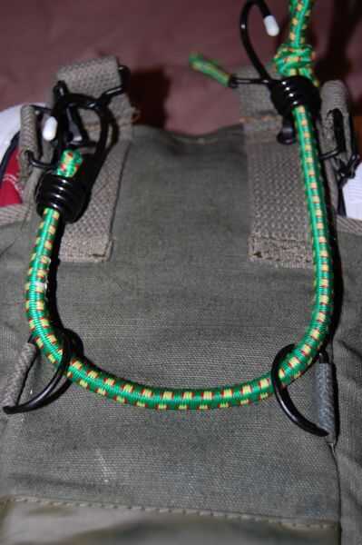 Decidí el bungee ganchos a través de los ganchos superiores de la correa de mi bolso del lazo. Esto significó que la bolsa no deslice hacia abajo la cuerda del amortiguador auxiliar cuando conectado a la moto.
