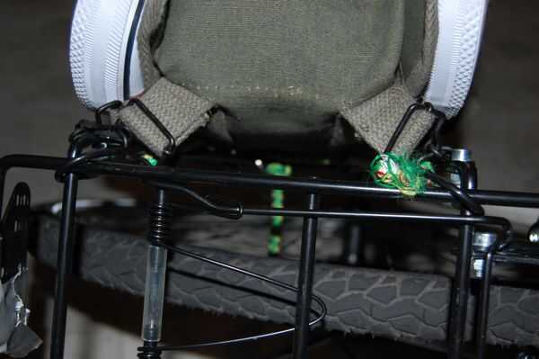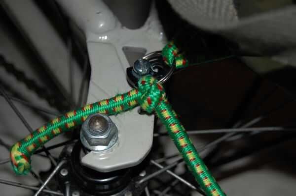 Bungee ganchos muy fácil, ir sobre la rejilla. Luego tire hacia abajo el bucle y acople a algo en la parte inferior de la parrilla. En mi bici hay una tuerca en el perno de fijación entre el bastidor y el marco, así que esto no era un lugar obvio para unirla.
