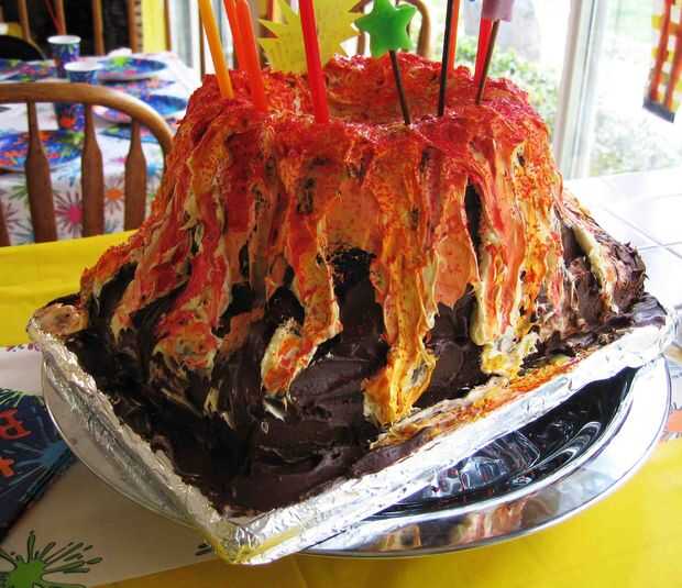 Ahora que se diviertan! Con un cuchillo y palillos de dientes lava la pintura hacia abajo los lados del pastel con el glaseado rojo y amarillo. Trate de no mezclar demasiado los colores o conseguir el marrón en la lava. Crear lotes de dimensión con capas de glaseado.