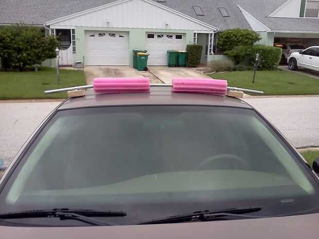 Este estante evolucionó desde una versión anterior que solo usa los tallarines de la piscina grande con correa de trinquete que lo atraviesa. Problema es que la carga aún puede llegar a golpear la parte superior del coche y atornillar la pintura. Si usted no se preocupa acerca de su pintura, bien, haz lo que quieras. Quería algo un poco más robusto, así que caminé el hardware y estaba tan feliz cuando aún tenían los tallarines de la piscina.